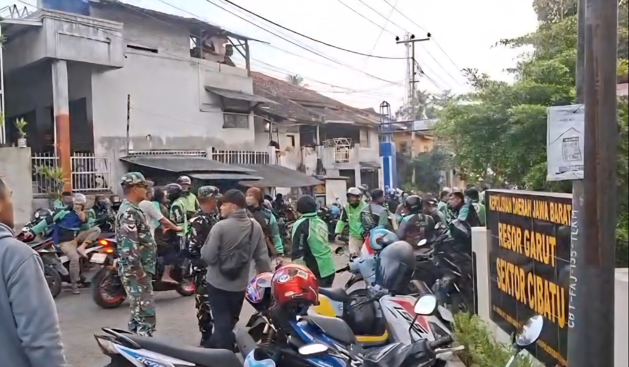 Aksi penganiayaan yang diduga dilakukan ojek pangkalan (Opang) itu tentu membuat berang kawan ojol lain, mereka dating jauh – jauh agar bisa menemukan para pelaku termasuk mendatangi Polsek Cibatu agar para pelaku bisa segera diamankan.